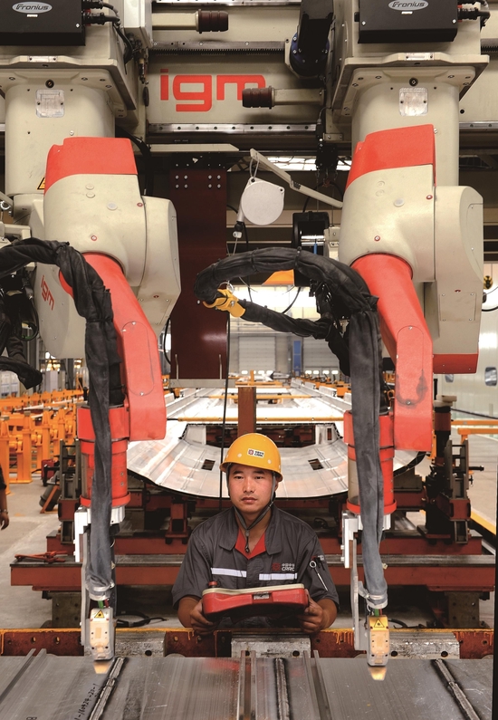 员工操作大型焊接机器人焊接高速动车组铝合金车体