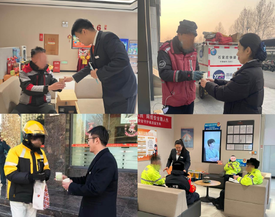 各营业网点也迅速响应号召,纷纷设立“爱心驿站”,热情邀请环卫工人、保安、交警、快递员、外卖小哥等进入网点驻足休憩,保暖御寒,并向他们送上了爱心热饮。