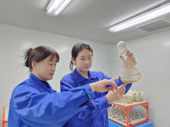 在母瓶和子瓶阶段,液体培养基和菌丝一直处于旋转晃动状态,他们会每日观察菌丝的生长情况。18种产品对应18种特性各异的菌株,并且每时每刻菌丝形态、生长状态各不相同,他们练就了“眼到”“心到”的基本功,总能及时发现菌丝挂壁的细微异常。“这些手、眼、心的技艺,没有上百次的实践是练不出真功夫的。”组长马静讲道,其中的奥秘全靠长期实践沉淀,19名组员在日复一日的实操中打磨出了娴熟技艺,成为菌种培育的“行家里手”。
