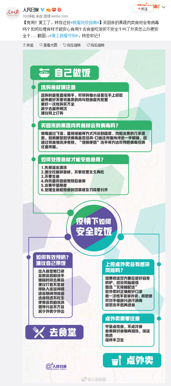 买回来的果蔬肉类食材会有病毒吗?如何处理食材才能安心食用?去食堂吃饭安不安全?叫了外卖怎么办更安全?戳图↓↓复工就餐守则,转走牢记!