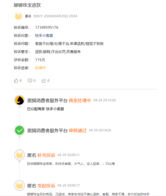 网友投诉快手小客服:娜娜珠宝退款 客服不处理