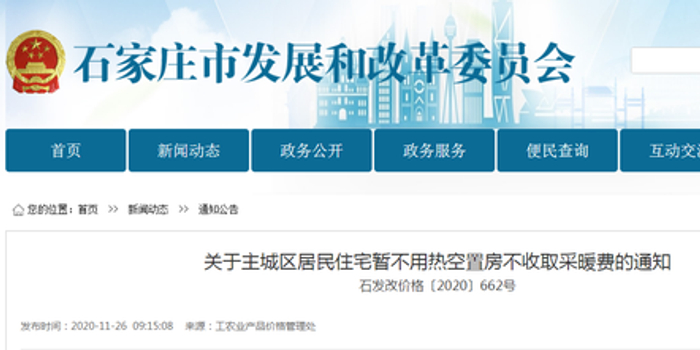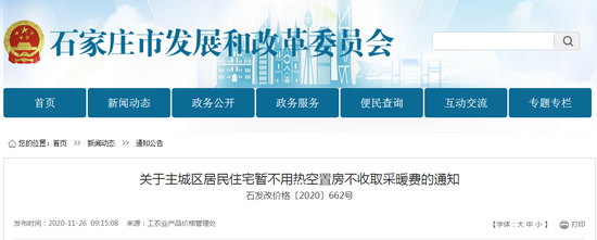 关注11月24日,石家庄市发展和改革委员会、市城市管理综合行政执法局、市财政局联合印发《关于主城区居民住宅暂不用热空置房不收取采暖费的通知》称,自2020—2021采暖季起,居民住宅采暖季暂不用热的空置房不再收取采暖费。已缴费的待采暖季结束后,由供热公司统一退还;尚未收取的,不再收取。