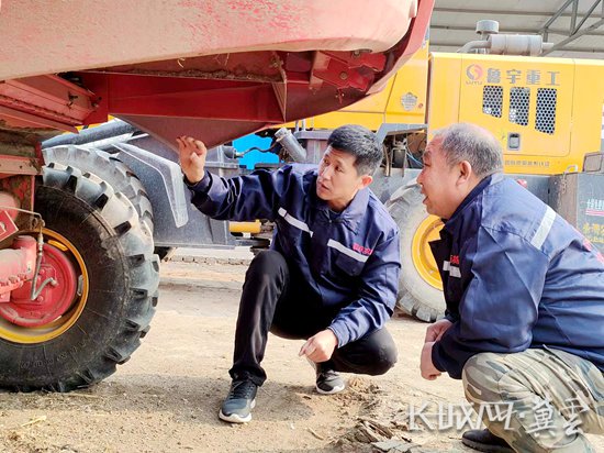 刘铁钧(右)和农机手一起保养维修农机具。长城网·冀云客户端记者 祝雪娟 摄