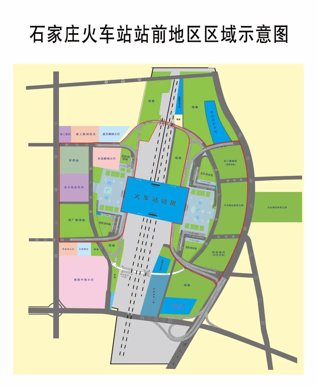 一、西广场接站。出租车进站待客通道由原来的新石南路进入地下停车场,调整为:新石中路—京广西街出租车专用通道—新石南路进入地下停车场。