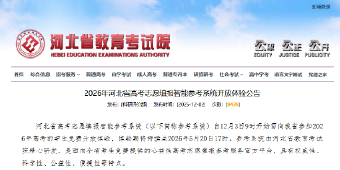 河北省高考志愿填报智能参考系统(以下简称参考系统)自12月3日9时开始面向我省参加2026年高考的学生免费开放体验,体验期将持续至2026年5月20日17时。参考系统由河北省教育考试院精心研发,是面向全省考生免费提供的公益性高考志愿填报参考服务官方平台,具有权威性、科学性、公益性、便捷性等特点。