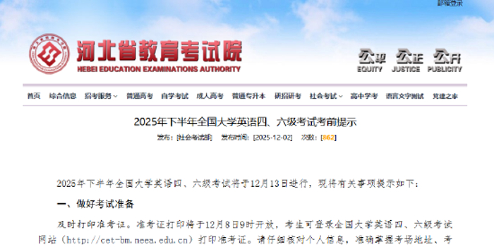2025年下半年全国大学英语四、六级考试将于12月13日进行,现将有关事项提示如下: