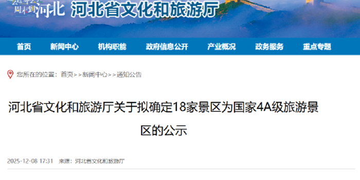 河北省文化和旅游厅关于拟确定18家景区为国家4A级旅游景区的公示