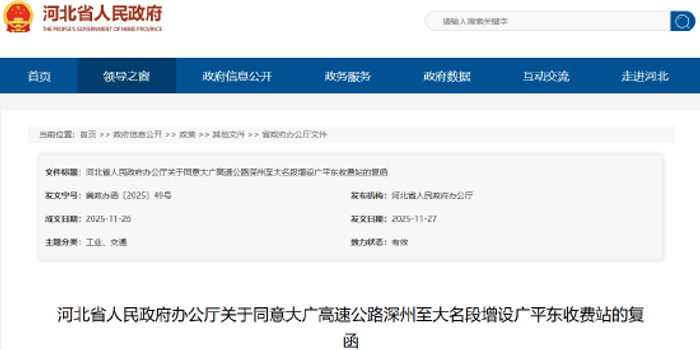 你们《关于大广高速公路深州至大名段增设广平东收费站的请示》(冀交公〔2025〕162号)收悉。经省政府研究,同意大广高速公路深州至大名段增设广平东收费站,收取机动车辆通行费,收费期限与大广高速公路深州至大名段一致。