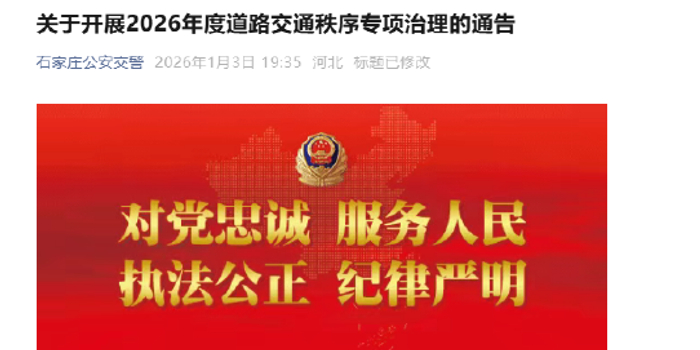 为营造安全、有序、文明、畅通的城市道路交通环境,提升城市形象和品质,保障人民群众出行安全,依据《中华人民共和国道路交通安全法》《中华人民共和国道路交通安全法实施条例》《河北省实施〈中华人民共和国道路交通安全法〉办法》等相关法律法规,石家庄市公安局交通管理局决定,自2026年1月4日起,在石家庄市全域范围内开展为期一年的道路交通秩序专项治理行动。现将有关事项通告如下: