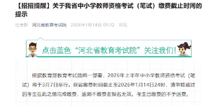 根据教育部教育考试院统一部署,2026年上半年中小学教师资格考试(笔试)将于3月7日举行。我省缴费时间截止至2026年1月14日24时,请审核通过的考生在此之前完成缴费,逾期不缴费者报名无效。考生已缴费的不予退费。