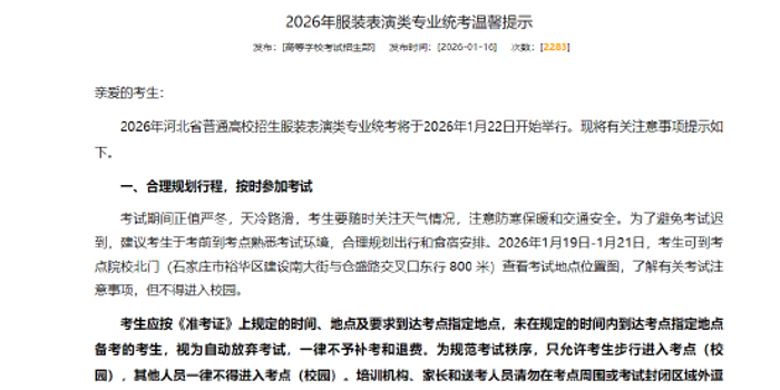 2026年河北省普通高校招生服装表演类专业统考将于2026年1月22日开始举行。现将有关注意事项提示如下。