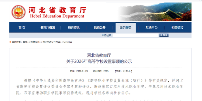 关注原标题:河北省教育厅关于2026年高等学校设置事项的公示